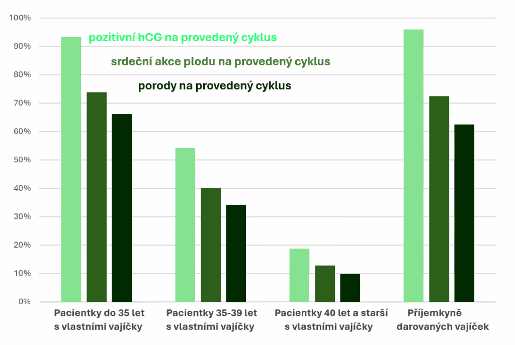 Sự thành công của chuyển phôi lạnh (KET) có thể được đánh giá dựa trên việc làm tổ thành công của phôi (hormone hCG dương tính trong máu bệnh nhân), thai lâm sàng được xác nhận (siêu âm xác nhận nhịp tim thai nhi) và cuối cùng – đối với chúng tôi (và đối với bạn), thông số quan trọng nhất – sinh nở thành công. Trong biểu đồ, chúng tôi đã phân chia nhóm bệnh nhân có trứng của chính mình theo độ tuổi tại thời điểm thu thập trứng và nhóm bệnh nhân nhận trứng hiến tặng hoàn toàn riêng biệt.