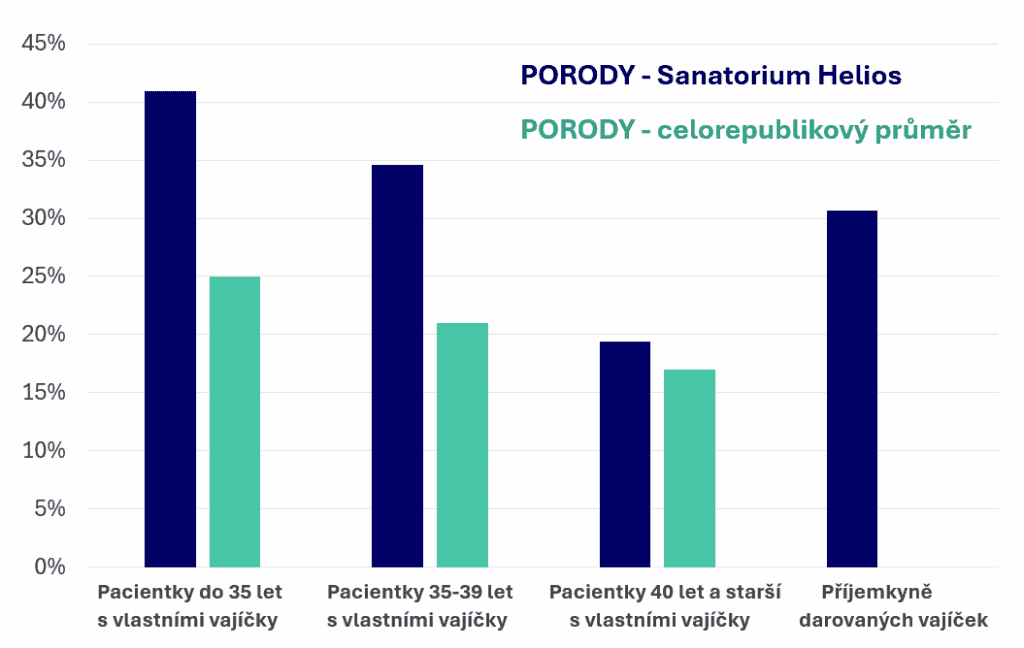Để so sánh, chúng tôi trình bày dữ liệu chính thức từ sổ đăng ký quốc gia, theo đó tất cả các trung tâm tại Cộng hòa Séc đều được yêu cầu báo cáo chu kỳ kinh nguyệt của họ (Sổ đăng ký Quốc gia về Hỗ trợ Sinh sản, NRAR; https://www.uzis.cz/res/f/008420/asistreprodukce2020.pdf). Trong tất cả các nhóm bệnh nhân (mặc dù dữ liệu đăng ký không chỉ bao gồm các chu kỳ sử dụng trứng của chính mình mà còn sử dụng trứng được hiến tặng), Bệnh viện Sanatorium Helios đều cao hơn đáng kể so với mức trung bình toàn quốc.